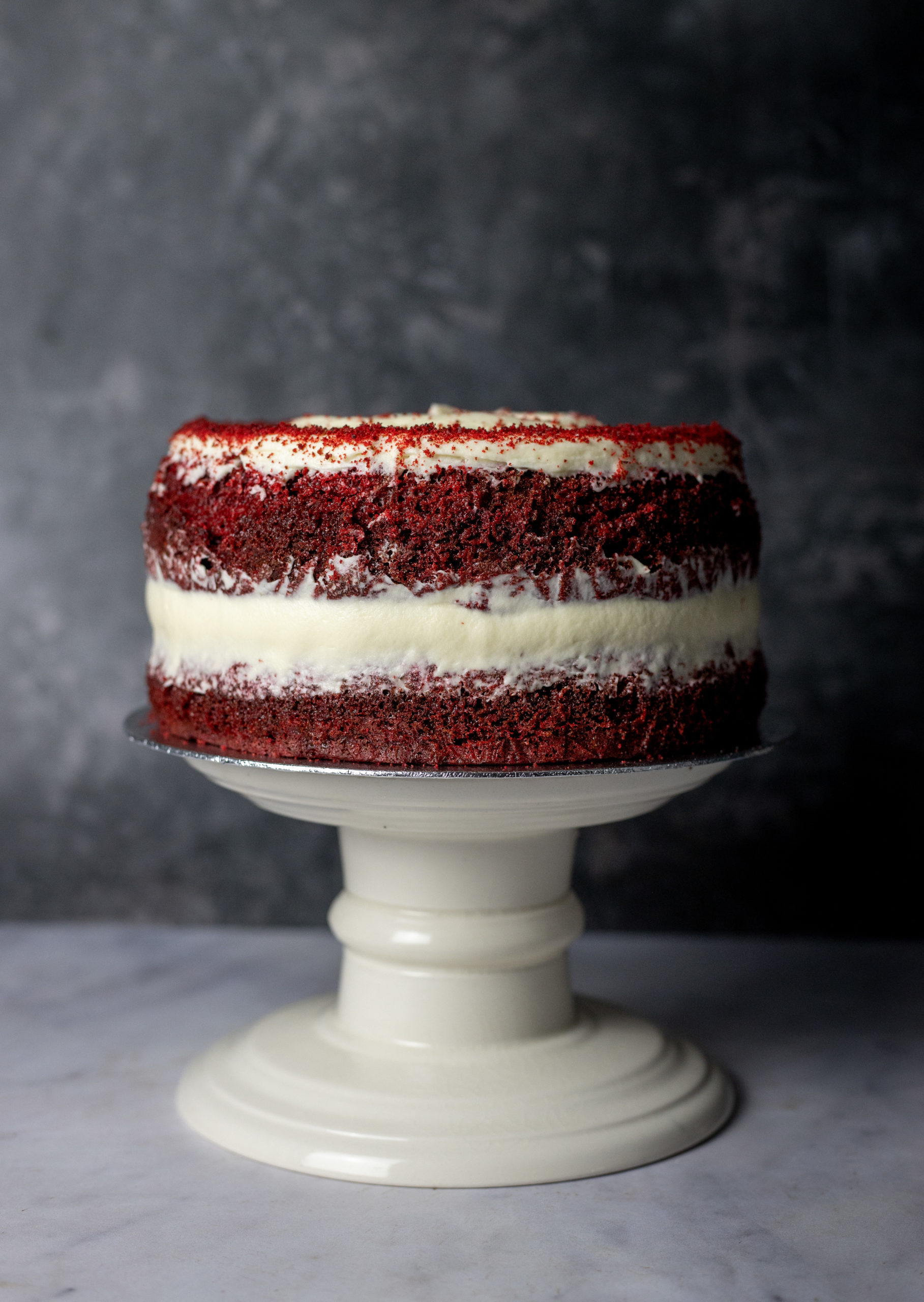 The American classic. Striking red sponge, flavoured with cocoa powder, filled and topped with a cream cheese buttercream and decorated with a beautifully red coloured crumb.